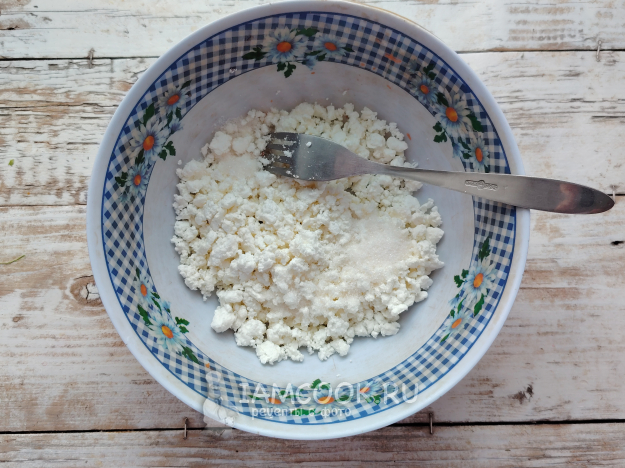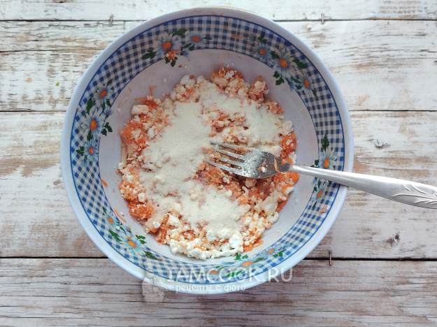 Творог подойдет даже зерновой, но в таком случае его необходимо растереть до однородности блендером или вилкой, можно это сделать сразу с добавлением сахара. Сахар можно и не добавлять совсем, если фрукт и овощ достаточно сладкие.