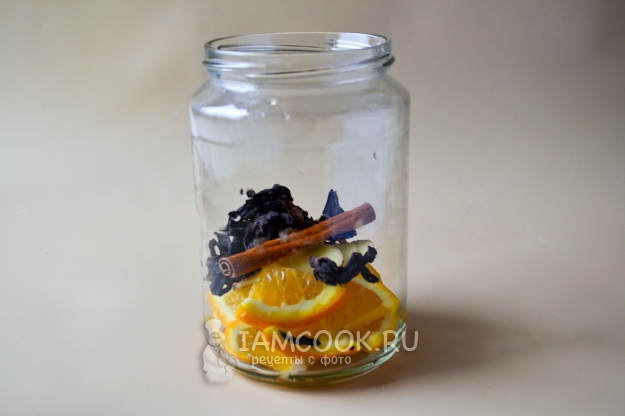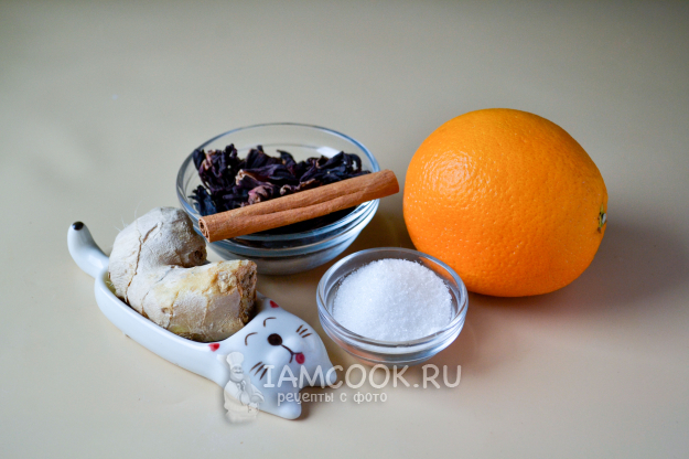 В банку положите нарезанный апельсин, имбирь, палочку корицы и чай каркаде. Палочку корицы можно заменить на молотую.