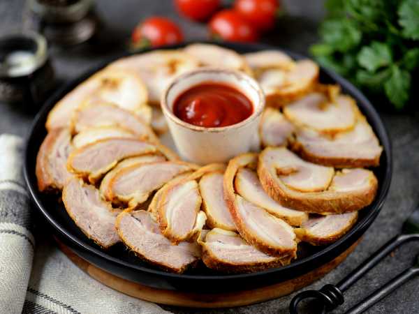 Остывшую буженину нарежьте острым ножом, переложите на блюдо и украсьте по своему желанию. Вкусного праздника и счастливого нового года!
