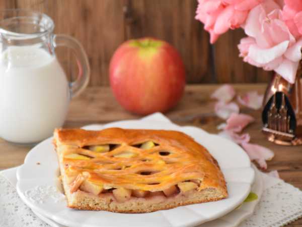 Выложить тесто в форму, разровнять. Второе яблоко также очистить и нарезать тонкими дольками. Выложить сверху на тесто внахлёст. Посыпать чайной ложкой кунжута.