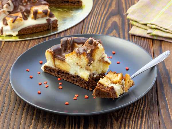Уложить второй корж и остальной крем. Убрать в холодильник для пропитки на несколько часов.
