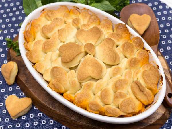 Мясо с овощами выкладываем в форму, в которой будем запекать. Поверх мяса выкладываем внахлест фигурки из теста. Из оставшегося теста можно сделать печенье, либо дополнительно украсить коблер.