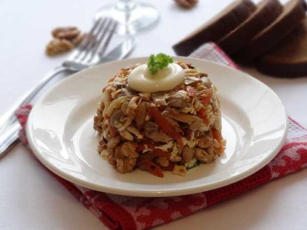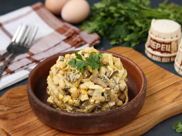 Оформить тарелку зеленью и подавать салат на стол.