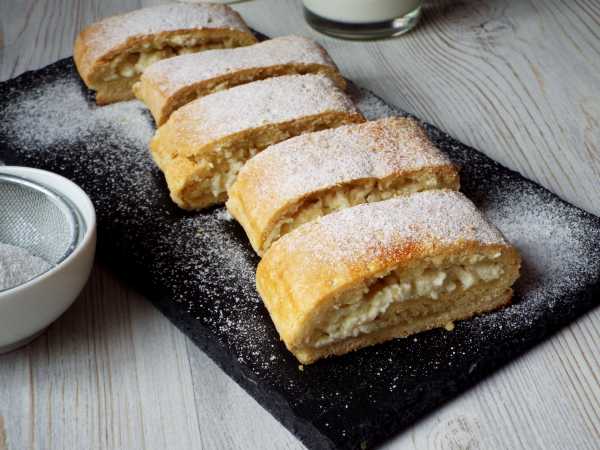 Этот вариант песочного теста готовится на основе муки, желтков и сливочного масла или маргарина, в творожную начинку идут белки яиц, сахар и сметана, яблоки подходят любого сорта с кожурой или без, а сухофрукты (например изюм) придают дополнительную натуральную сладость и разнообразие.