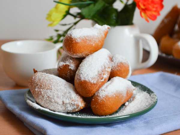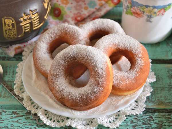 Затем остывшие пончики посыпаем сахарной пудрой. Из остального теста готовим аналогично остальные пончики.