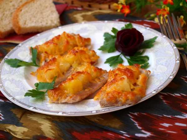 Итак, подготовьте свинину, кольца консервированного ананаса, майонез, соль, молотый перец, репчатый лук, твёрдый сыр. Нарежьте свинину на порционные куски. Ананасовые колечки просушите от сиропа.