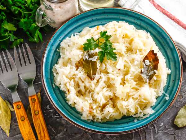 Выложите квашеную капусту в миску, если капуста слишком кислая, можно предварительно промыть ее водой. Добавьте фасоль, сахар, перец и семена тмина.