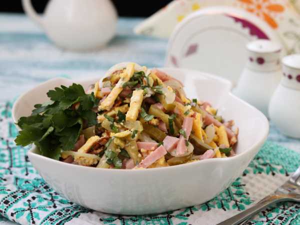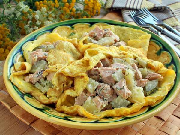 Попробуйте этот оригинальный салат с омлетом! Я в него влюбилась, очень вкусный! Омлет, нарезанный лапшой, солёные огурцы (именно солёные, как для оливье, не маринованные), маринованный лук и ветчина - оказывается, это очень вкусное и пикантное сочетание.