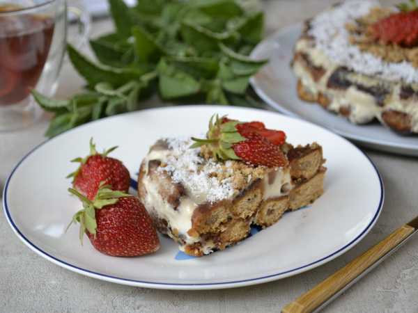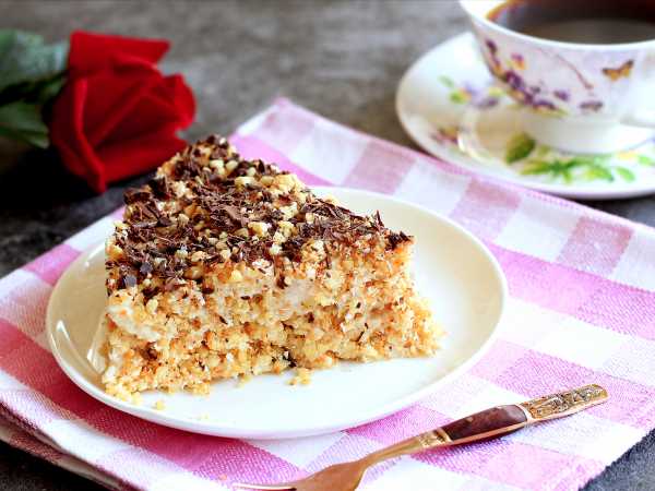 Обрезки коржей измельчаем руками и посыпаем ими торт. Убираем торт для пропитки на 7-12 часов в холодильник.