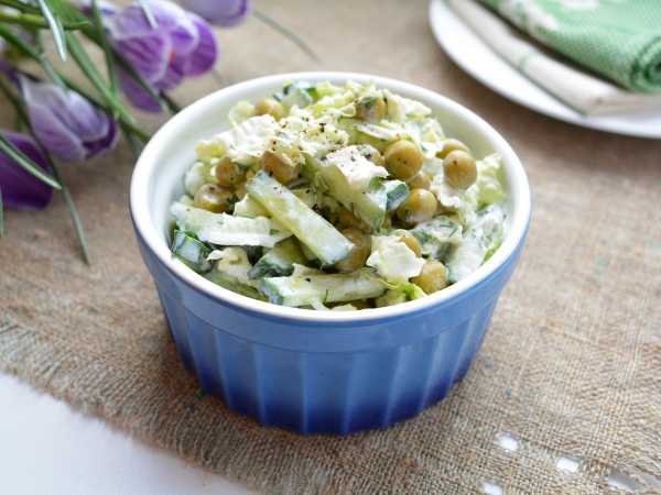 Для приготовления салата нужно взять свежую белокочанную капусту, зелёный консервированный горошек, свежие огурцы, морковь, зелёный лук, зелень укропа, майонез, чёрный молотый перец и соль.