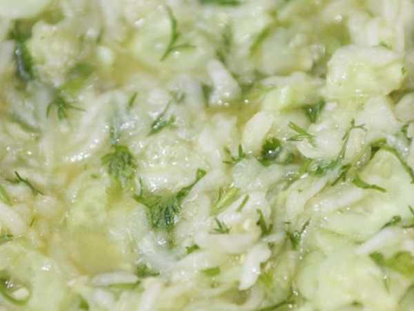 Смешать капусту с морковью, слегка посолить и чуть-чуть помять.