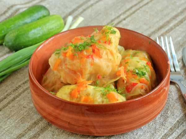 Когда овощи потушились, выкладываем на них голубцы, немного утапливаем их в овощах, добавляем воды и накрыв крышкой оставляем на маленьком огне на 40 минут.