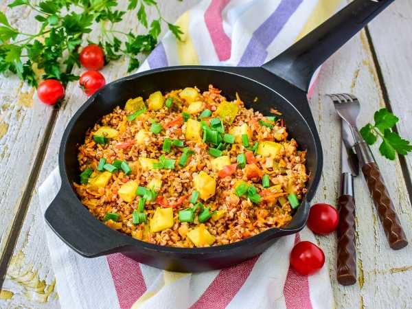 Перемешаем, прогреем все вместе минуты две. Вкусная гречневая каша с кабачком готова!