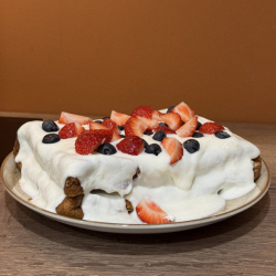 Промазать кремом коржи, верх торта и бока. Убрать торт в холодильник на ночь.