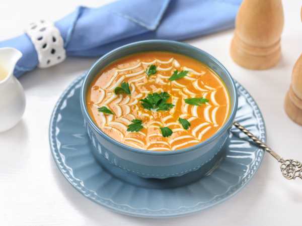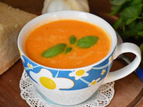 Диетический томатно-тыквенный суп-пюре готов! Подавайте его к столу в горячем виде с зерновыми хлебцами, а в качестве украшения можно добавить немного порезанных черных оливок и зелени.