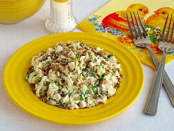 Соединяем в мисочке все подготовленные ингредиенты и заправляем салат майонезом. Пробуем на вкус и солим.
