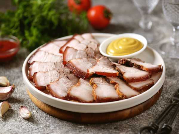 Вареная в луковой шелухе заготовка извлекается из кастрюли и остужается. Если вам хочется иметь более насыщенный оттенок «копчености», оставьте рулет в емкости до полного остывания.