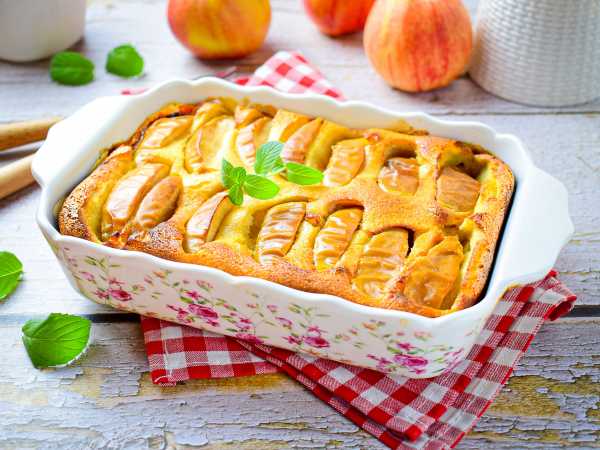 Наполним форму для запекания приготовленной ранее жидкой основой для запеканки. Духовку разогреем до 200-220 градусов и уберем в нее форму примерно на 50 минут.