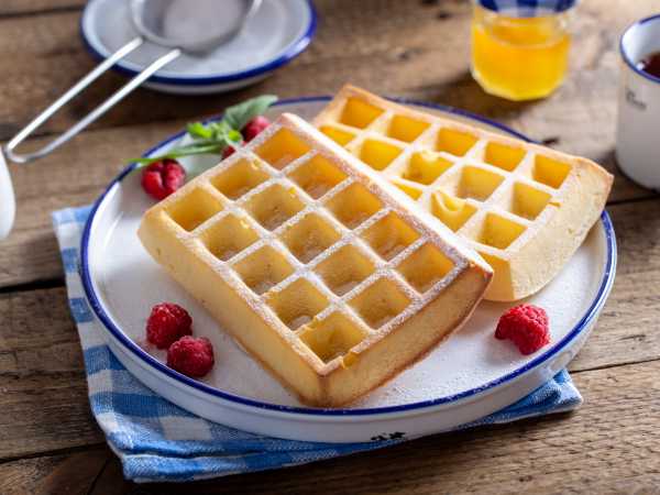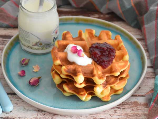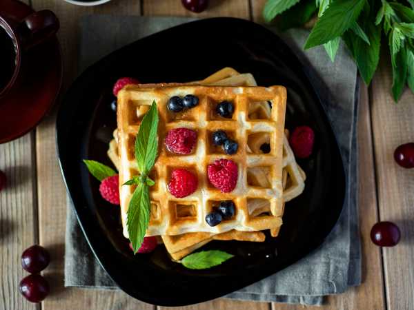 Выкладываем примерно по 2 столовые ложки теста на одну вафлю в заранее разогретую вафельницу. Я выкладываю тесто в центр и не разравниваю его, так как если плохо рассчитать нужное количество и разровнять тесто, то при его нехватке, вафельки сверху будут плохо выпекаться и не получится красивых ячеек. Выпекаем 4-6 минут, в зависимости от мощности прибора, до румяной корочки.