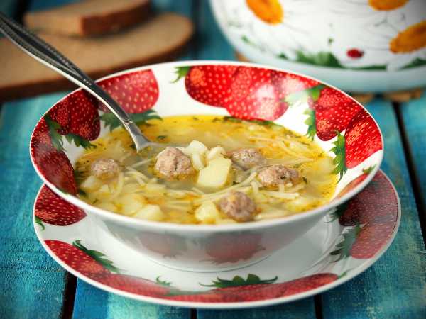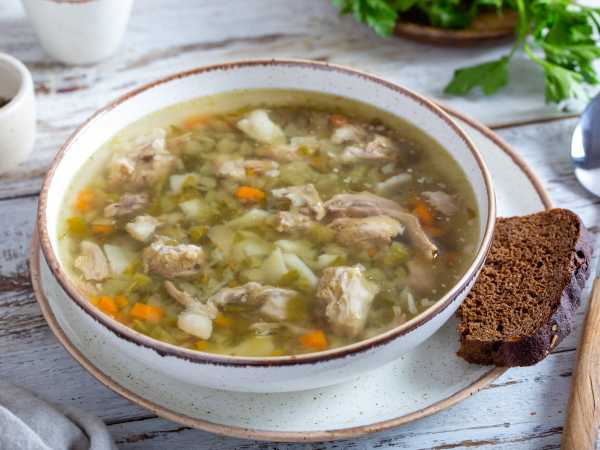 Свинину нарежьте порционно, сложите в кастрюлю, залейте холодной водой и поставьте на плиту. Снимая образующуюся в процессе закипания пену, дайте воде закипеть, затем бульон посолите и варите мясо минут 20. Тем временем картофель почистите и нарежьте кубиками.