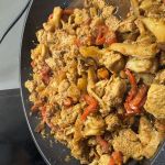 Добавить лук и морковь к курице. Обжаривать 5 минут.