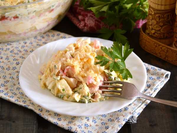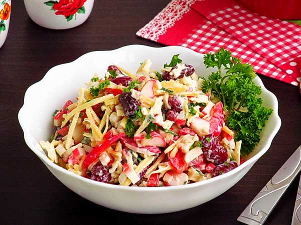 Салат из фасоли, сыра, крабовых палочек и перца можно назвать как повседневным, так и праздничным. Повседневным его можно считать за доступность продуктов и сытность, а праздничным - за яркость и пикантный вкус. К нему не нужно много украшений, он сам - украшение стола. Лишь несколько веточек петрушки придаст ему законченный вид.