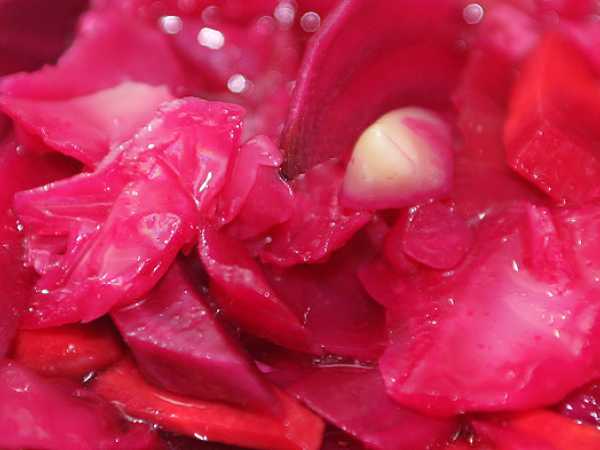 У меня были головки капусты примерно по одному килограмму. Я разрезала каждую капусту на 8–12 частей — пополам, потом на четверти, а затем каждую четверть ещё на 2–3 части. Цвет готовой капусты получился насыщенным, равномерным и очень ярким даже в середине кусочков, между листьями.