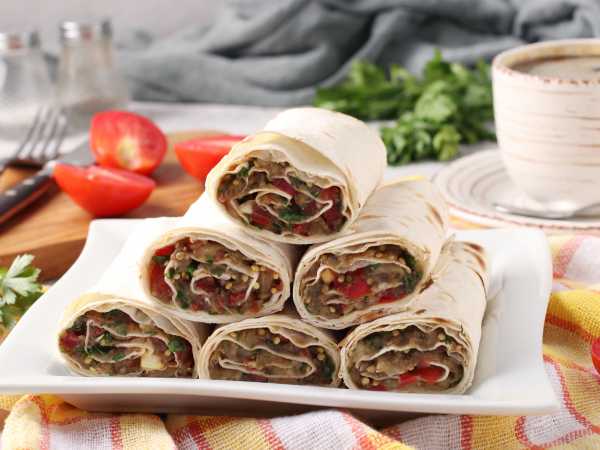 Разрезать лаваш на две или больше частей, зависит от размера лаваша. Свернуть лаваш любым удобным способом: трубочкой или конвертиком.