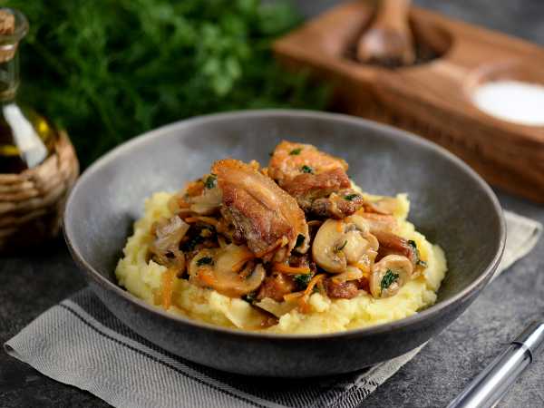 На лук выложите колечки картофеля. Приправьте солью и молотым перцем, сдобрите майонезом. Сверху уложите пластинки грибов. Также немножко подсолите и сдобрите майонезом.