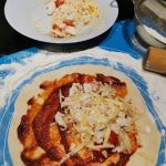 Раскатайте в круглый пласт. Смажьте томатной пастой или соусом. На одну половинку уложите курицу, помидоры, твёрдый сыр. Если нужно, подсолите и поперчите.