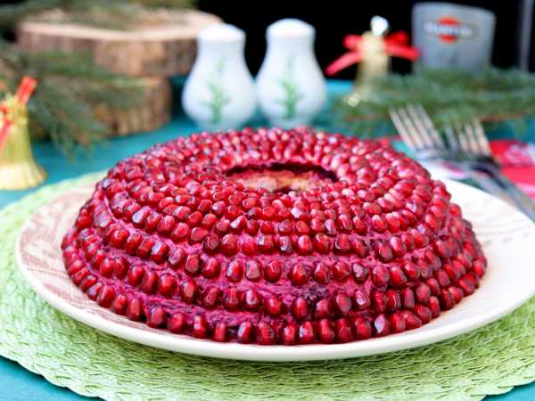 Готовому салату даем настояться и пропитаться около часа в холодильнике. К столу классический салат «Гранатовый браслет» подаём украсив зеленью.