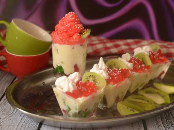 Сегодня нежные бананы дополняем кисло-сладкими киви, сочными яблоками, освежающими мандаринами, ягодным ассорти, а для зыбкой субстанции берем, например, лимонное желе.