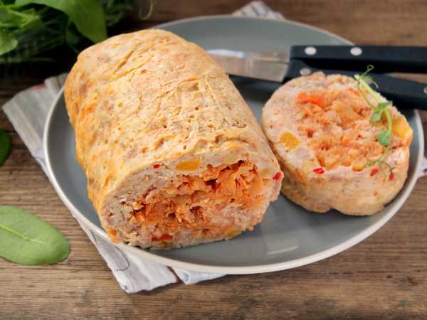 Изменил немного. 1кг. Прованские травы, 2 зубчика чеснока, половина тонко нарезанного болгарского перца, соль. 50 минут. 200градусов. Хорошо завернуть. Сочный вкусный рулет на завтрак или как вы хотите как итог!