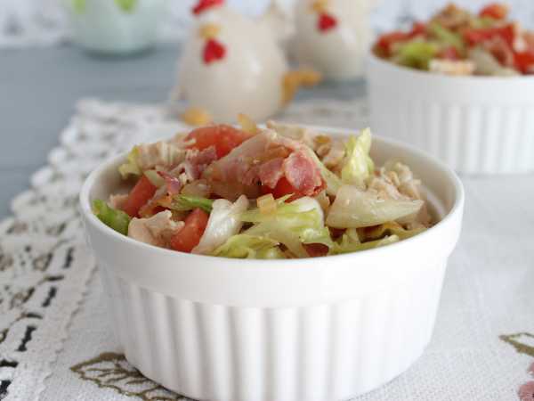 Сложить все нарезанные составляющие в удобную миску, кроме салата и помидоров. Капусту следует отдельно чуть подсолить и немного пожмакать руками. Перемешать все овощи вместе с заправкой.