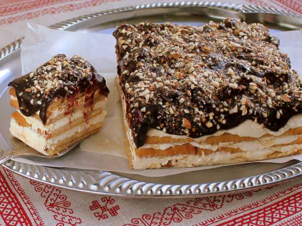 Разрежьте сметанный десерт с песочным печеньем на порционные кусочки.