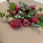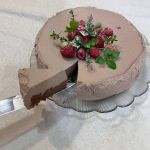 Утром я вынула муссовый торт из холодильника, сняла пергамент, присыпала сахарной пудрой и украсила свежей клубникой и листиками мяты.
