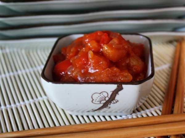 Измельчите все ингредиенты в относительно однообразную жидкую кашицу, главное, чтобы кусочки перца стали очень мелкими.