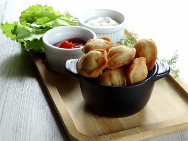 Защипните края теста, сначала придав форму полумесяца, а затем скрепите его концы между собой. Укладывайте пельмени в один слой на деревянные досочки, присыпанные мукой.