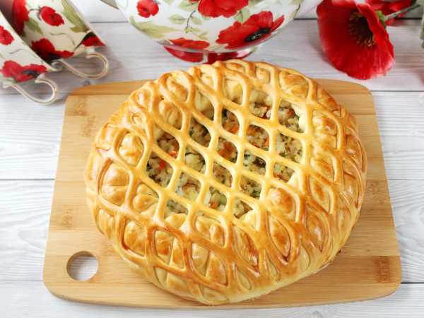 Повторите процесс с оставшимися полосками теста. Край пирожка подверните (подробнее смотрите в видеоверсии рецепта).