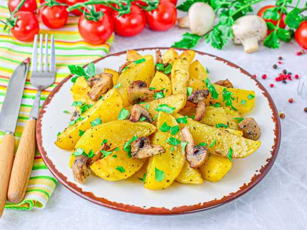 Подготовленную запеканку поместите в разогретую до 180-200 градусов духовку. Все компоненты блюда уже готовы, поэтому выпекать картофельную запеканку с курицей и грибами в духовке будем до получения румяной корочки.