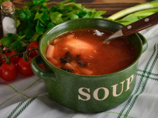 Когда овощи готовы – добавьте в бульон подготовленное сало с чесноком, хорошо все перемешайте, потомите на небольшом огне еще примерно минуту и выключите огонь.