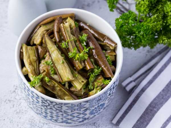 Баклажаны для этого блюда лучше взять подлиннее, но не старые. Нарезаем их полосками толщиной 5 мм. Посыпаем баклажаны крупной солью. Оставим их в соли на 10-15 минут. За это время баклажаны отдадут свою горечь. После этого помоем их под проточной водой, обсушим бумажными полотенцами, чтобы избавиться от влаги.