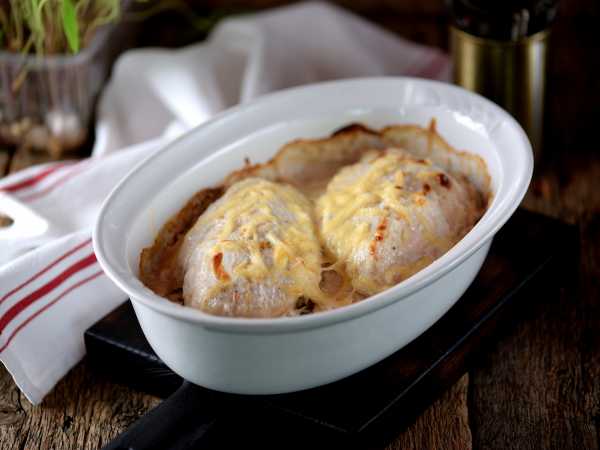 Сыр можно натереть на терке, а если у вас сыр уже нарезан порционными пластинами, то выложите их также внахлест. Натертым же сыром просто равномерно посыпьте помидоры. Сверху можно посыпать сыр паприкой, но это уже больше для красоты. Отправляем форму с курицей в разогретую до 170 градусов С духовку на 25-30 минут.