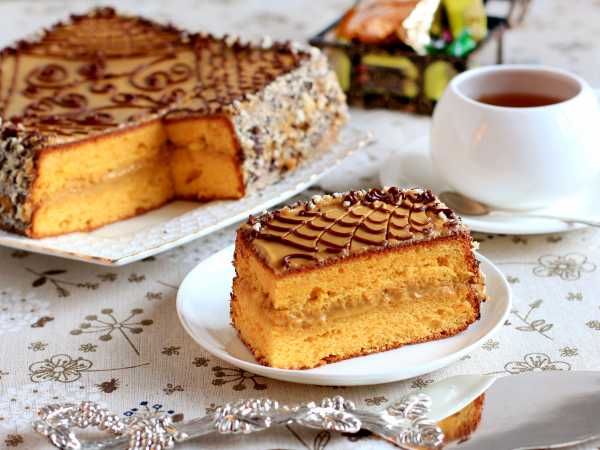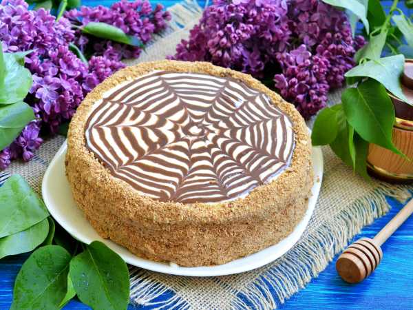 На поверхность торта нанести тонкий слой крема и посыпать песочными крошками. Отправить торт-медовик «Рыжик» в холод для пропитки.