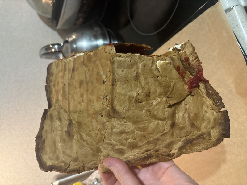 У меня корж получился сухой , тонкий . Выпекала по температуре , как в рецепте 160 гр - 30 мин .