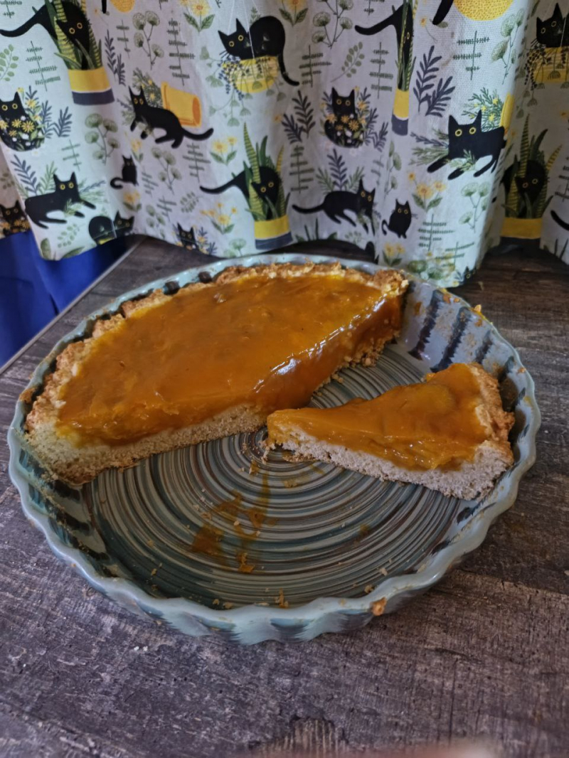 Готовила с замороженными абрикосами. Очень вкусно. Не дождалась полного остывания, рез получился смазанным. Холодный режется отлично!